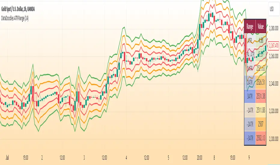 Customizable Table: A data table is displayed at the bottom right corner of the chart, providing real-time values for ATR, EMA ATR, and the various ATR ranges.
