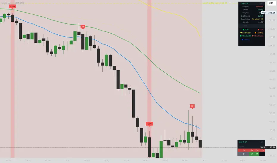 - Regime, Trend strength, Volume, Big Picture (MTF score), Fear Index, Signal count