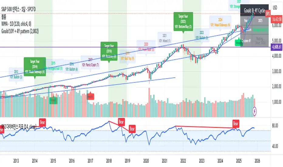 Overview This indicator is a comprehensive tool for macro-market analysis, designed to visualize historical market cycles on your chart. It combines Edson Gould’s famous Decennial Pattern with a Customizable 4-Year Cycle (e.g., 2002 base) to help traders identify long-term trends, potential market bottoms, and strong bullish years.