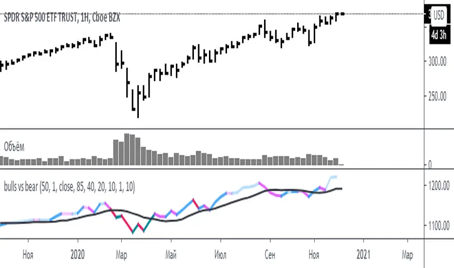 Also added here is a moving average with a default period of 10 - theoretically, if the indicator is above the moving average - the initiative is behind the bulls - if below - the initiative is behind the bears.
