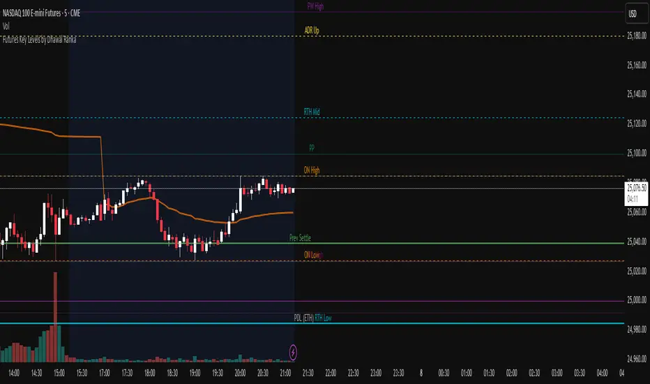 This indicator renders one consolidated map of intraday reference levels for futures (e.g., ES, NQ, GC, CL). It is session-aware and draws: