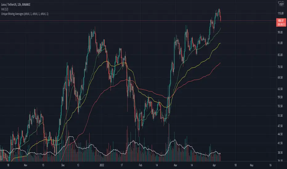 These are Unique Variable Moving Averages based off an idea from LazyBear that use volatility in determining a smoothing constant. The twist is that this script uses the extremity of a Volume based RSI reading (of various lengths for each band) to determine the length of each moving average. The potential lengths for each band increase exponentially, meaning the green band will always be faster than yellow, and yellow faster than red.