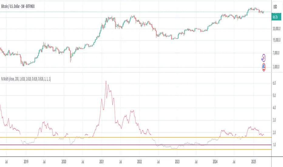 Al Po Multiples - is the logical evolving of a very well known to every bitcoiner Mayer Multiples formula. Instead of fixed constants (like 200MA, current price and below or above the 1, etc.), I use a variable values which helps in general to set the very best values for separate timeframes.