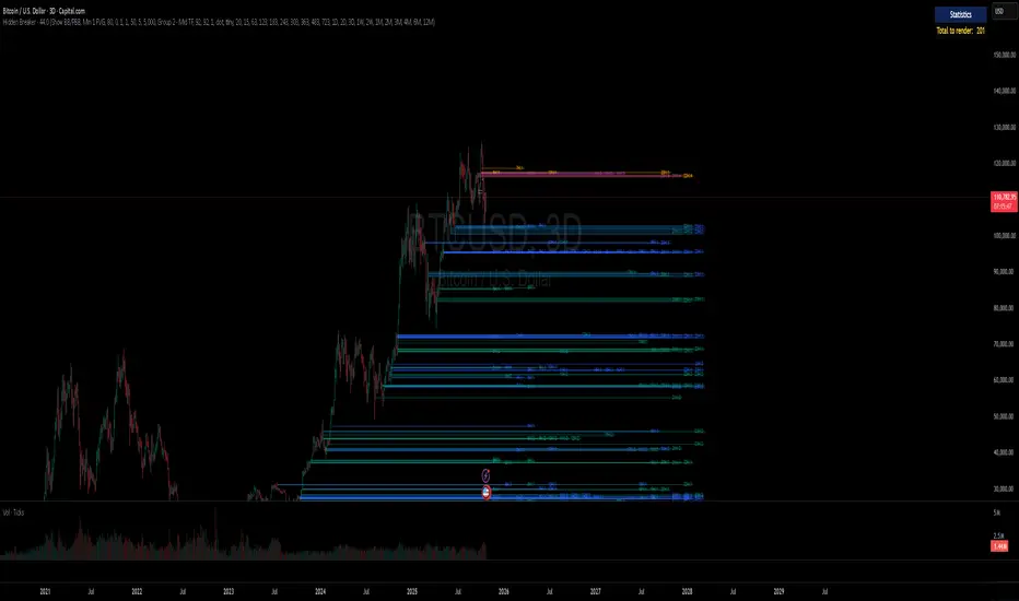 The Hidden Breaker identifies Order Blocks and tracks their transformation when they interact with Fair Value Gaps. It displays both standard Order Blocks and those modified by FVG (Breaker Blocks) across multiple timeframes within a single chart view.