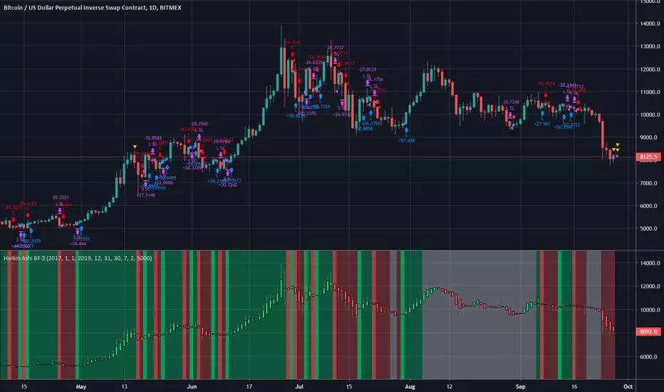 This strategy simply enters a long when the Heiken Ashi candles turn green and a short when they turn red.