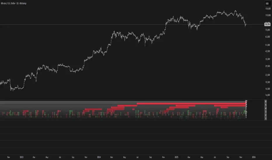 - Multi-Timeframe Engine: The script runs 10 independent RSI calculations in the background, organized in rows from bottom (Short Term) to top (Long Term).