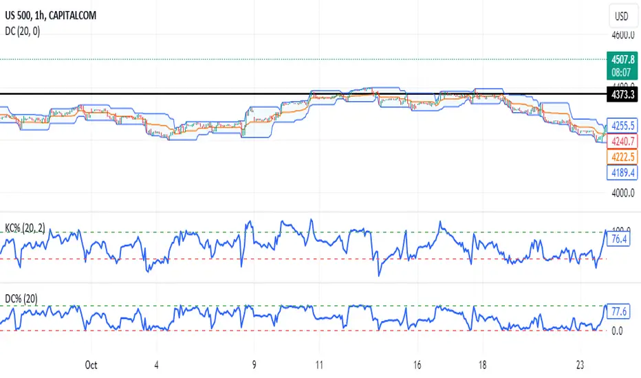 Percentage Calculation: DC% quantifies where the current price lies within the channel, presented as a percentage. A value of 0% indicates the price at the channel's low, and 100% signifies the price at the high.