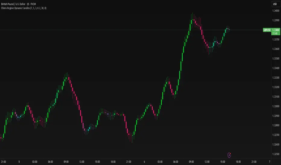 The indicator uses advanced Ehlers signal processing techniques to identify market regimes and create dynamically colored candles that reflect market conditions.
