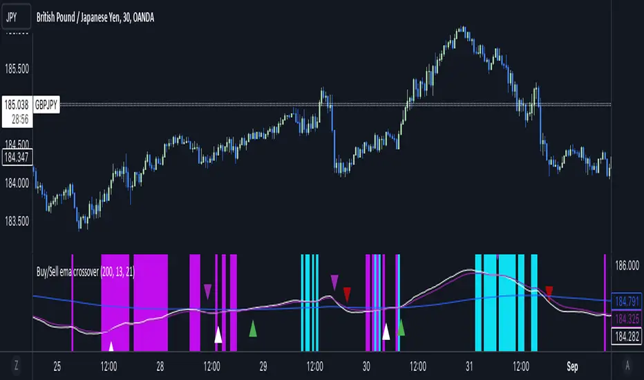 The white triangles below, which are created when the 13 ema is higher than the 21 ema, indicate a possible bullish zone while the purple triangles above (13 ema lower than the 21) could suggest a bearish reflex