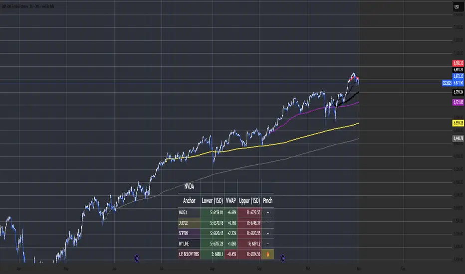 OverviewMulti-Anchor VWAP Deviation Dashboard (Optimized Global with Pinch Detection) is an overlay indicator that computes up to five user-defined Anchored Volume Weighted Average Prices (AVWAPs) from custom timestamps, along with their standard deviation bands for volatility assessment. It plots the lines and bands, displays real-time percentage deviations from the current close to the AVWAPs, and includes optional pinch detection to identify price compression within the bands. This enables precise analysis of price positioning relative to key events (e.g., earnings, news) or periods (e.g., weekly opens), with a compact dashboard for quick scans and potential squeeze signals. Optimized for performance, it uses manual iterative calculations to handle dynamic anchor changes without repainting.