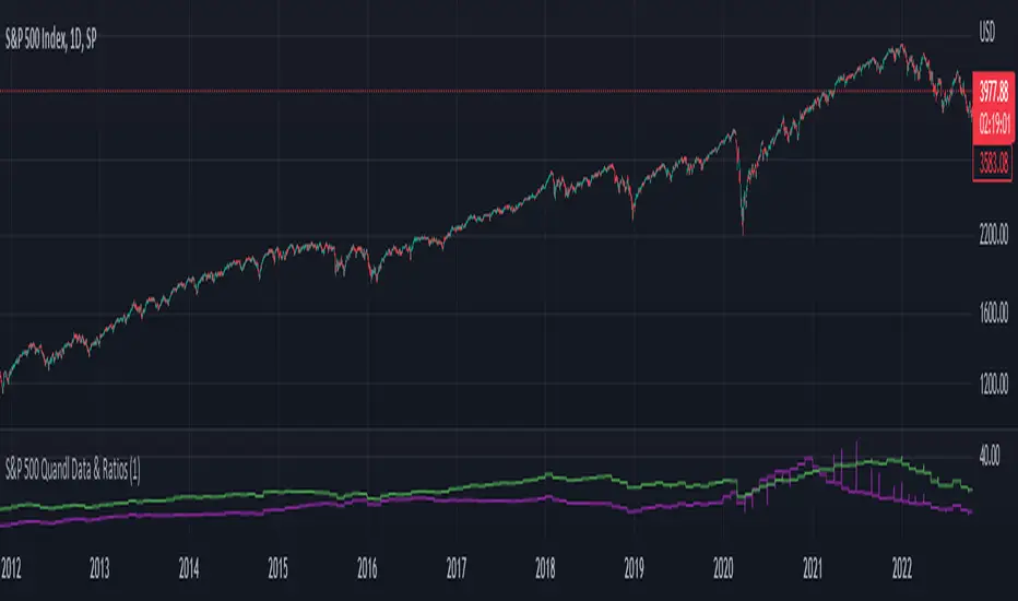 TradingView has a little-known integration that allows you to pull in 3rd party data-sets from Nasdaq Data Link, also known as Quandl. Today, I am open-sourcing for the community an indicator that uses the Quandl integration to pull in historical data and ratios on the S&P500. I originally coded this to study macro P/E ratios during peaks and troughs of boom/bust cycles.