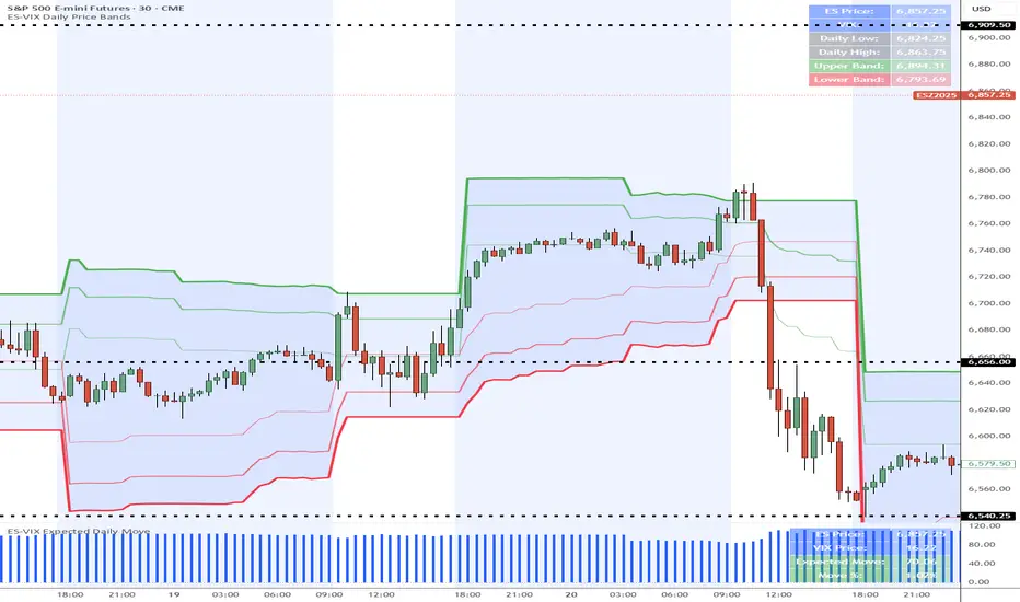 This indicator plots dynamic intraday price bands for ES futures based on real-time volatility levels measured by the VIX (CBOE Volatility Index). The bands evolve throughout the trading day, providing volatility-adjusted price targets.
