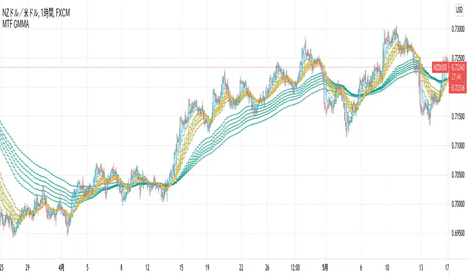 Multi time frame GMMA indicator that shows GMMA of the current timeframe and GMMA of upper time frame(MTF GMMA).