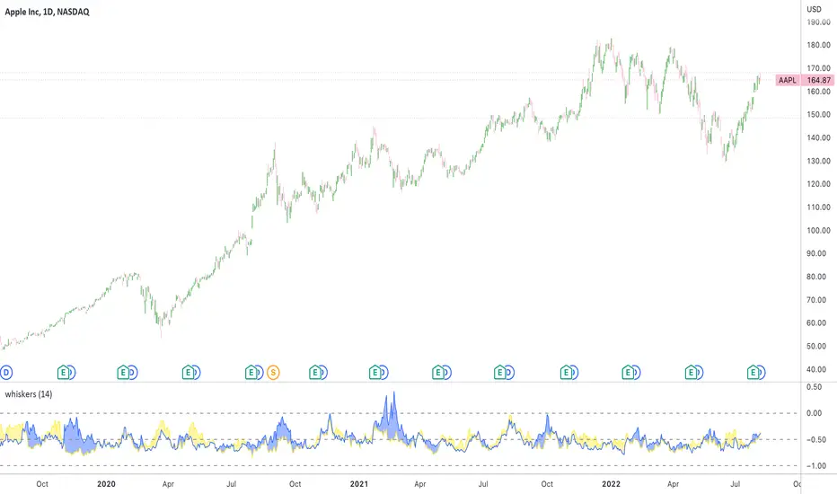 The Whisker Reversal Oscillator shows the average length of the top and bottom whiskers on candlesticks over a defined length. It plots the percentage difference between the whiskers and the length of the body, with the yellow line representing the average length of the top whisker, and the bottom line indicating the average length of the bottom whisker.
