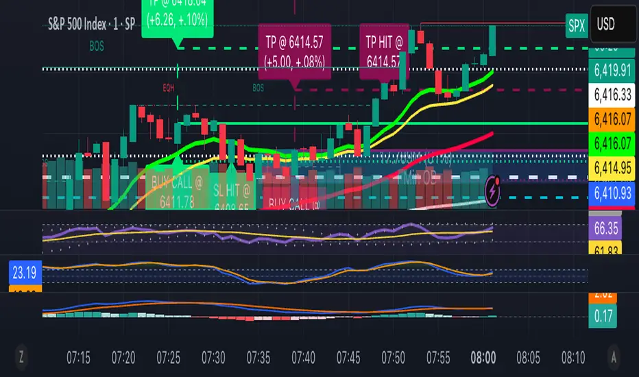 This tool looks for price “touches” of the 13-EMA, only takes CALL entries when the 13 is above the 48 (uptrend) and PUT entries when the 13 is below the 48 (downtrend), and confirms with a simple candle pattern (green > red with expansion for calls, inverse for puts). Touch sensitivity is ATR-scaled, so signals adapt to volatility. Each trade gets auto-drawn entry, TP, and SL lines, colored labels with $ / % distance from entry, plus optional TP/SL hit alerts. A rotating color palette and per-bar label staggering help keep the chart readable. Old objects are auto-pruned via maxTracked.