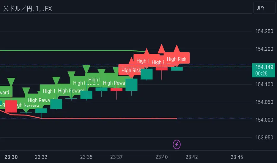 4. Labels: Provides real-time labels showing the risk/reward ratio, and marks the current conditions as “High Risk” or “High Reward” based on the calculated ratio.