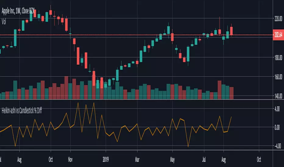 This script shows the price difference ( %) between heikin ashi and candlestick for all investment instruments as Close, Open, High and Low. (Switchable )