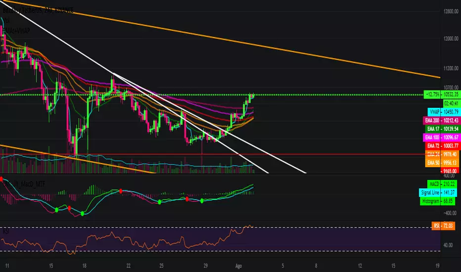 Indicador personalizado com 6 EMAs + VWAP. Recomendo utilização do tema escuro e EMAs 50, 100 e 200.