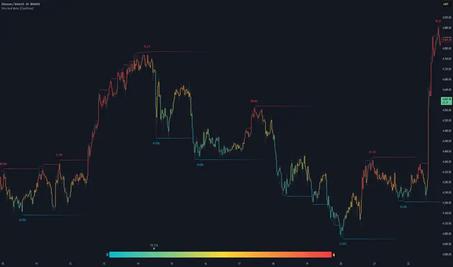 Price Heat Meter [ChartPrime] visualizes where price sits inside its recent range and turns that into an intuitive “temperature” read. Using rolling extremes, candles fade from ❄️ aqua (cold) near the lower bound to 🔥 red (hot) near the upper bound. The tool also trails recent extreme levels, tags unusually persistent extremes with a % “heat” label, and shows a bottom gauge (0–100%) with a live arrow so you can read market heat at a glance.