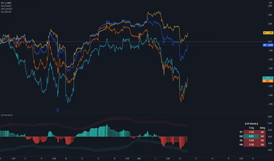 The Litt Internal Pro is based on the four major U.S. Equity Indexes. This is to not be used for any other markets. If you need more information on any of the indexes, you can google or watch YouTube videos on what they are. Typically if we are looking for to be long we want to see all four of the indexes green and have buy ratings. If we are looking to be short we want to see all four of the indexes red and have sell ratings. If you see Overbought or Oversold ratings it may be best to wait for a pullback to get long or not take the trade at all.
