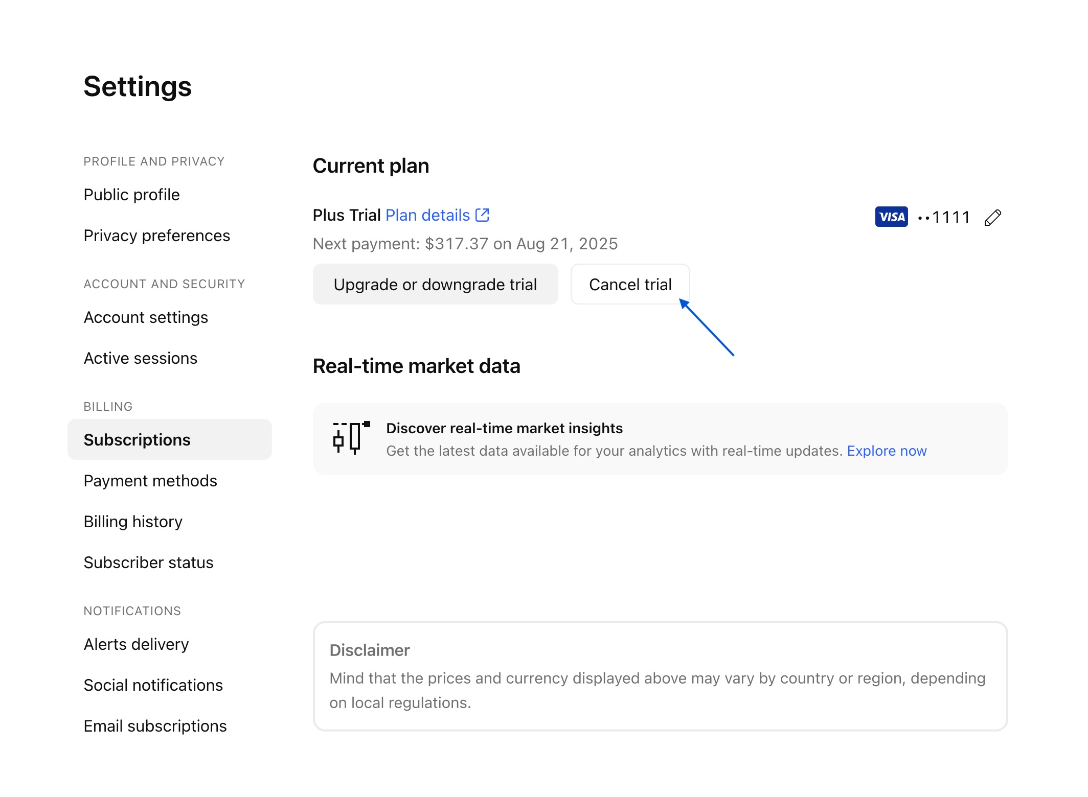 Vous pouvez annuler votre essai gratuit en un seul clic. Ouvrez l'onglet Facturation dans votre profil d'utilisateur et cliquez sur le bouton Annuler l'essai.