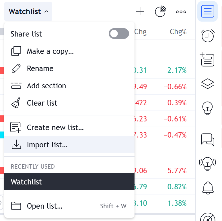 Pour importer une watchlist, cliquez sur le nom de la watchlist dans la barre d'outils de droite et sélectionnez la fonction « Importer liste... » dans le menu.