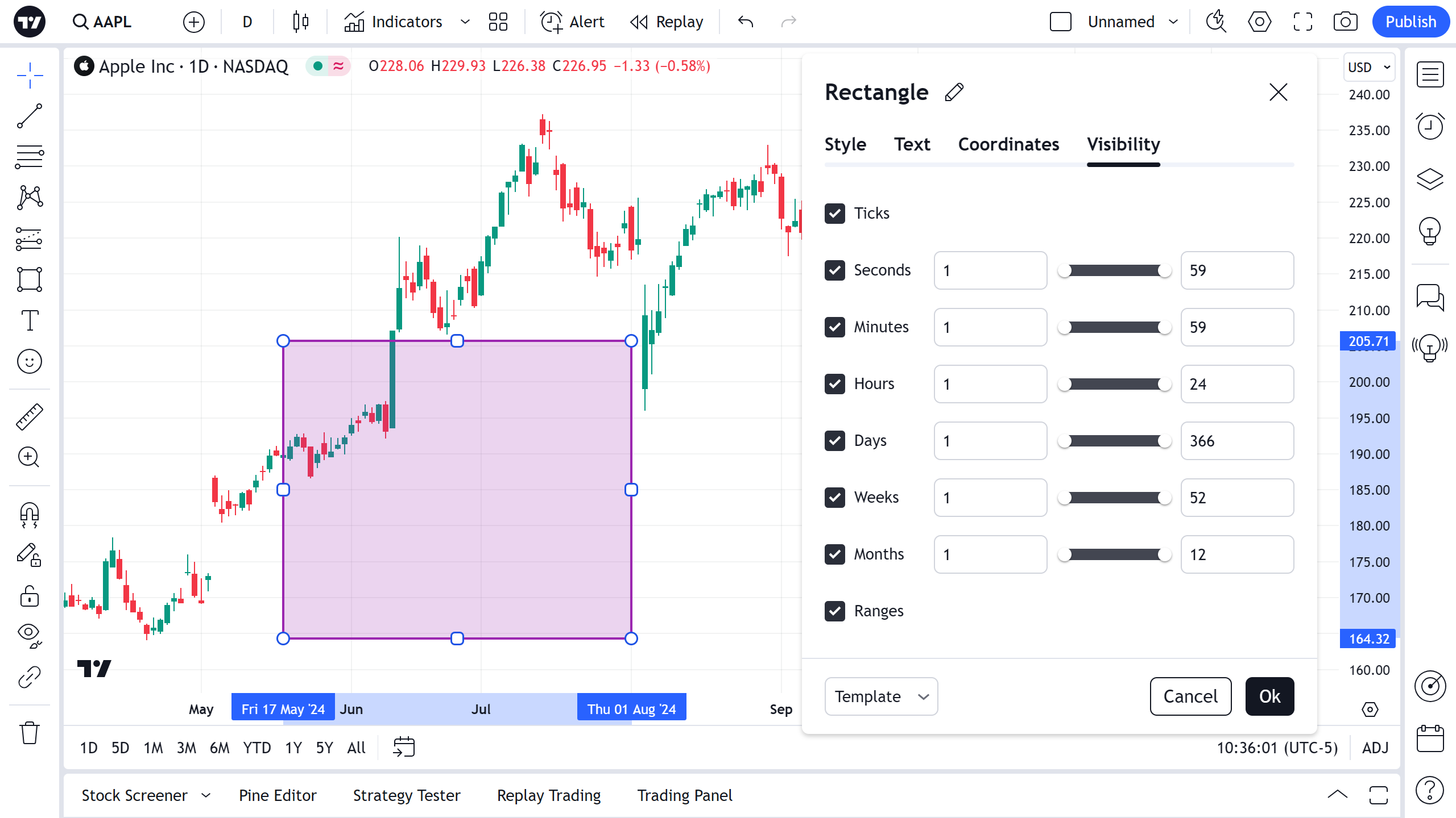 Dans la fenêtre des paramètres, sous l'onglet Visibilité, vous pouvez configurer les périodes pendant lesquelles le rectangle est affiché sur le graphique.