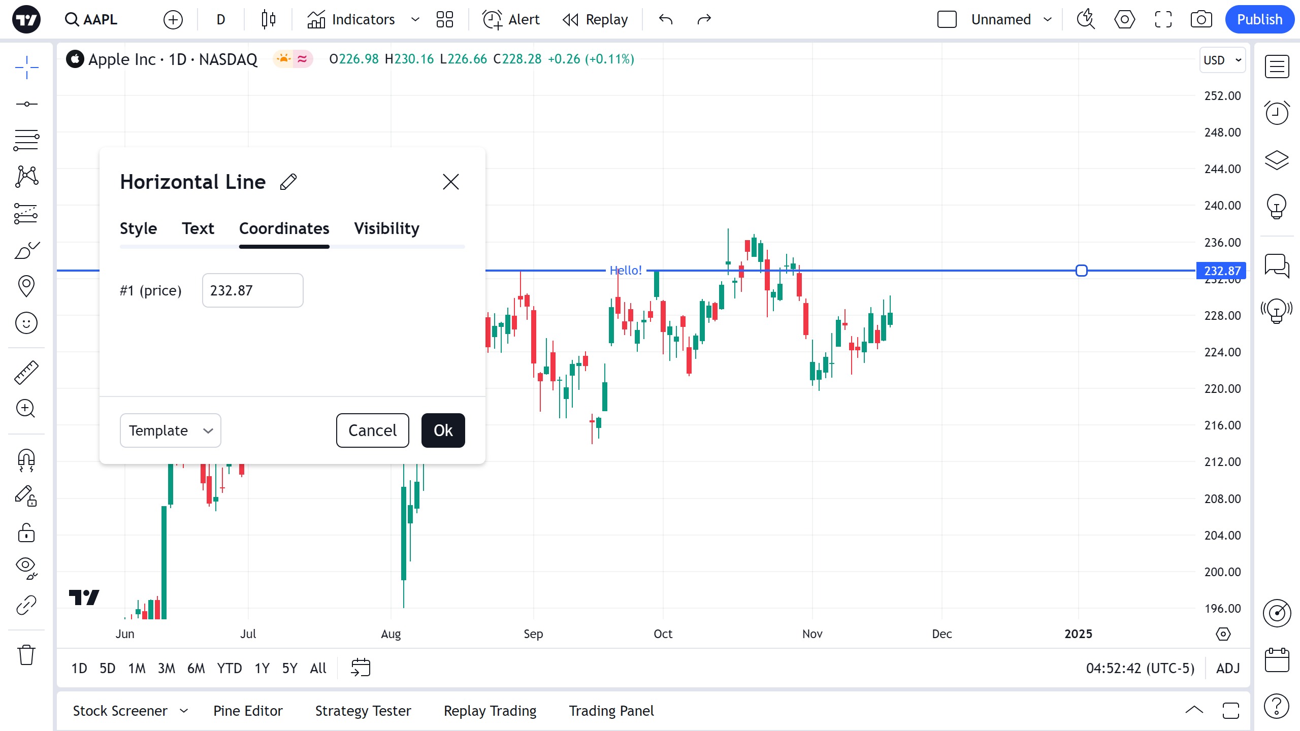 Dans la boîte de dialogue Propriétés des coordonnées, vous pouvez définir précisément la position de la ligne horizontale sur l'échelle de prix (en définissant le prix).