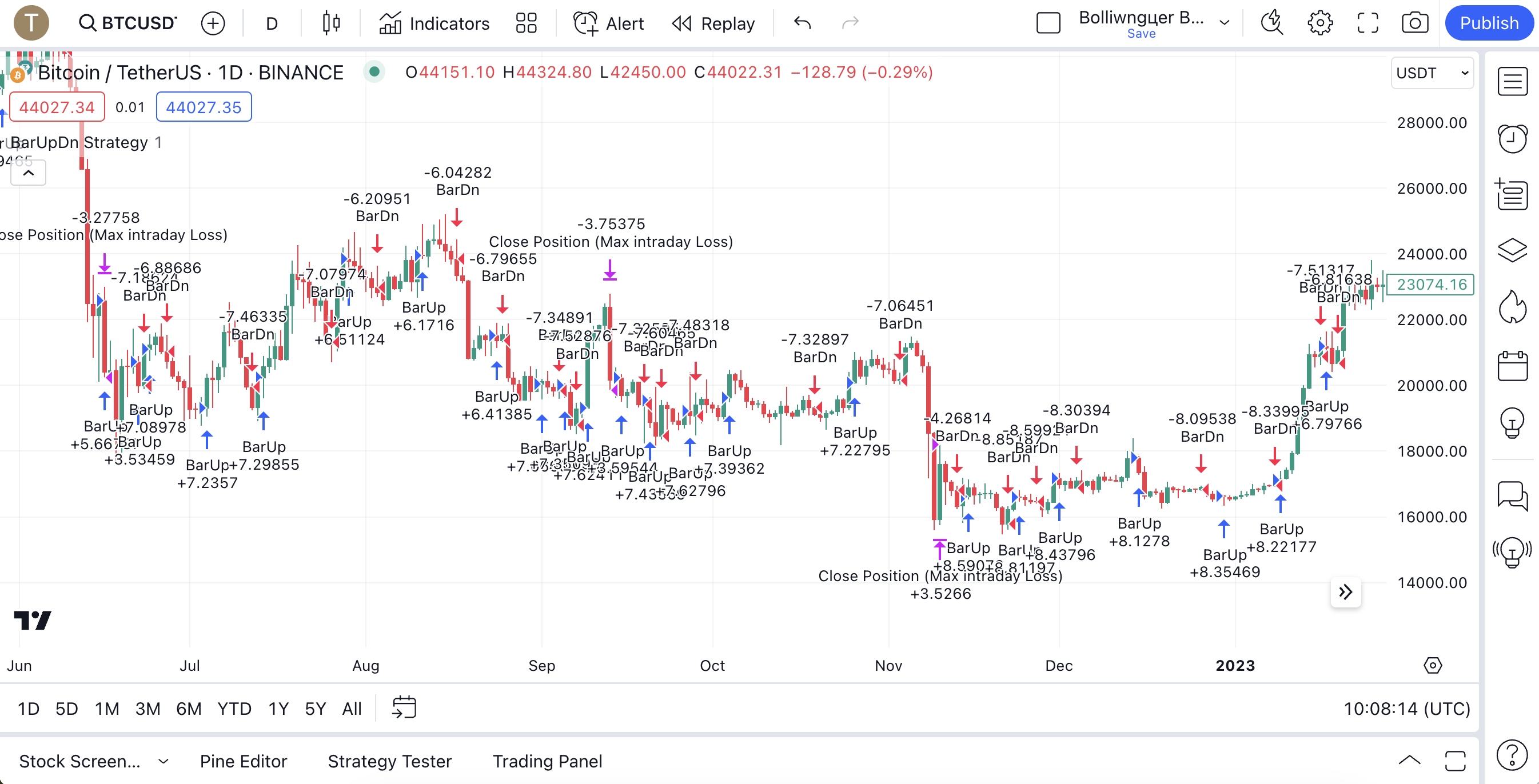 Les stratégies sont des scripts spécifiques, écrits en langage Pine Script, qui sont capables d'envoyer, de modifier, d'exécuter et d'annuler des ordres d'achat ou de vente et de simuler des transactions réelles directement sur votre graphique.