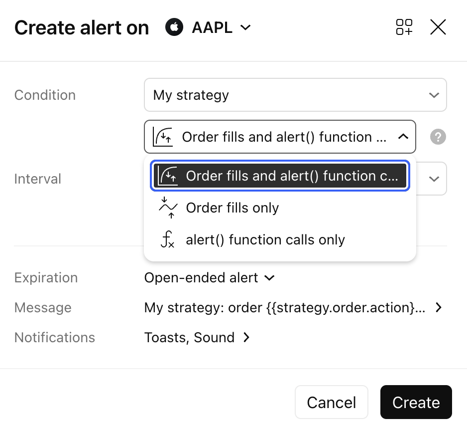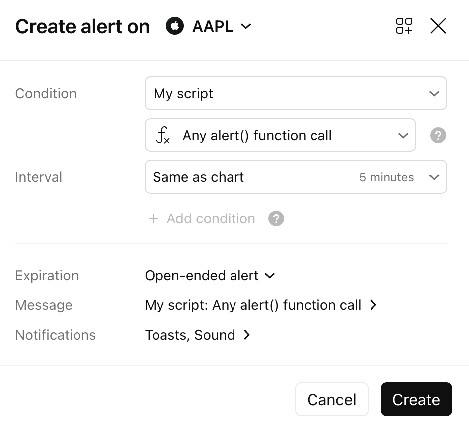 Dans Pine Script®, il existe une fonction supplémentaire qui vous permet de configurer des alertes. Elle s'appelle alert() et vous la verrez dans le code lorsqu'elle est configurable. À partir de Supercharts, vous pouvez créer une alerte à l'aide de la boîte de dialogue « Créer une alerte » et sélectionner l'indicateur ou la stratégie dans le champ « Condition ».Contrairement aux autres types d'alertes, la fréquence de déclenchement et le message sont déterminés par les appels alert() du script, et non par les paramètres de la boîte de dialogue.Pour créer une alerte basée sur alert() pour un indicateur :