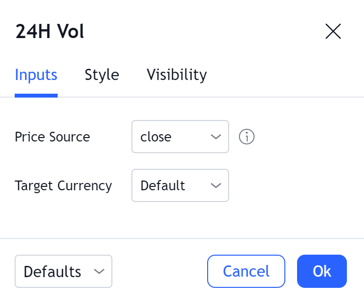 L'indicateur affiche toujours le volume sur 24 heures converti dans la devise sélectionnée dans les entrées de l'indicateur. Cela signifie que, si la bourse présente ses données de volume en devise de base (par exemple, lorsque pour BTCUSD, le volume représente le nombre de BTC échangés), l'indicateur de volume sur 24 heures convertit le volume de base en volume en devise en multipliant le volume par le prix sur le graphique. L'entrée "Source du prix" peut être utilisée pour sélectionner la valeur spécifique du graphique qui sera utilisée pour cette conversion.