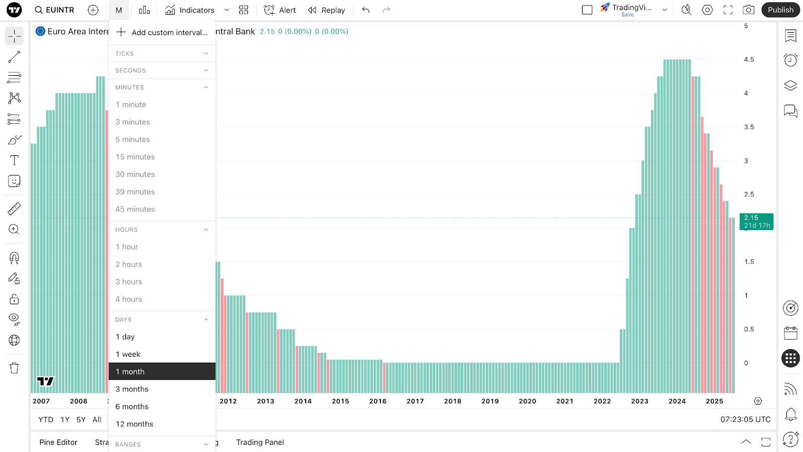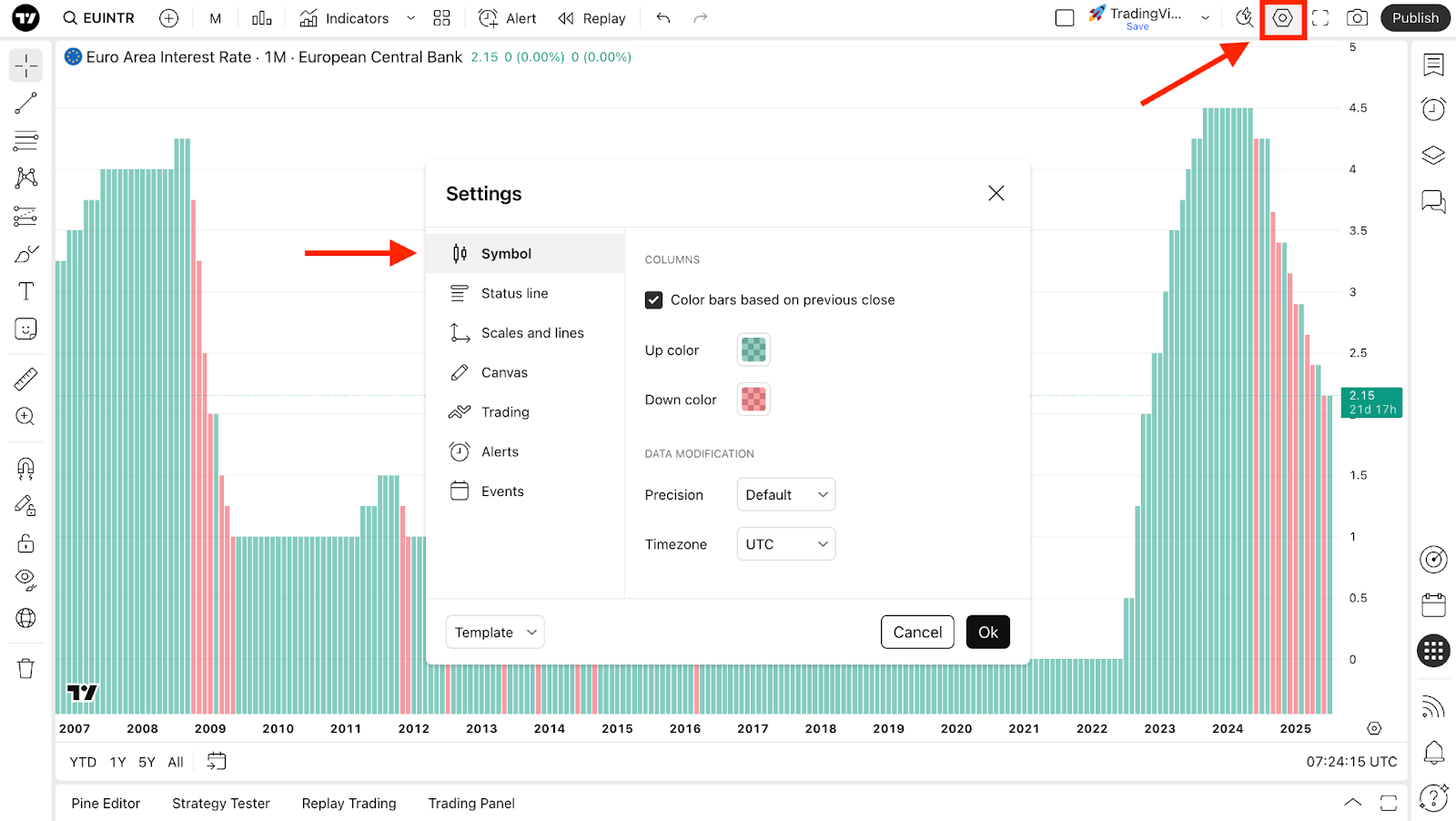Vous pouvez utiliser les graphiques à colonnes pour afficher des indicateurs économiques tels que le PIB, les taux d'intérêt ou les taux d'inflation. Ils apparaîtront sous la forme d'une série consécutive de colonnes vertes et rouges, vous aidant à repérer facilement les tendances et les changements macroéconomiques.