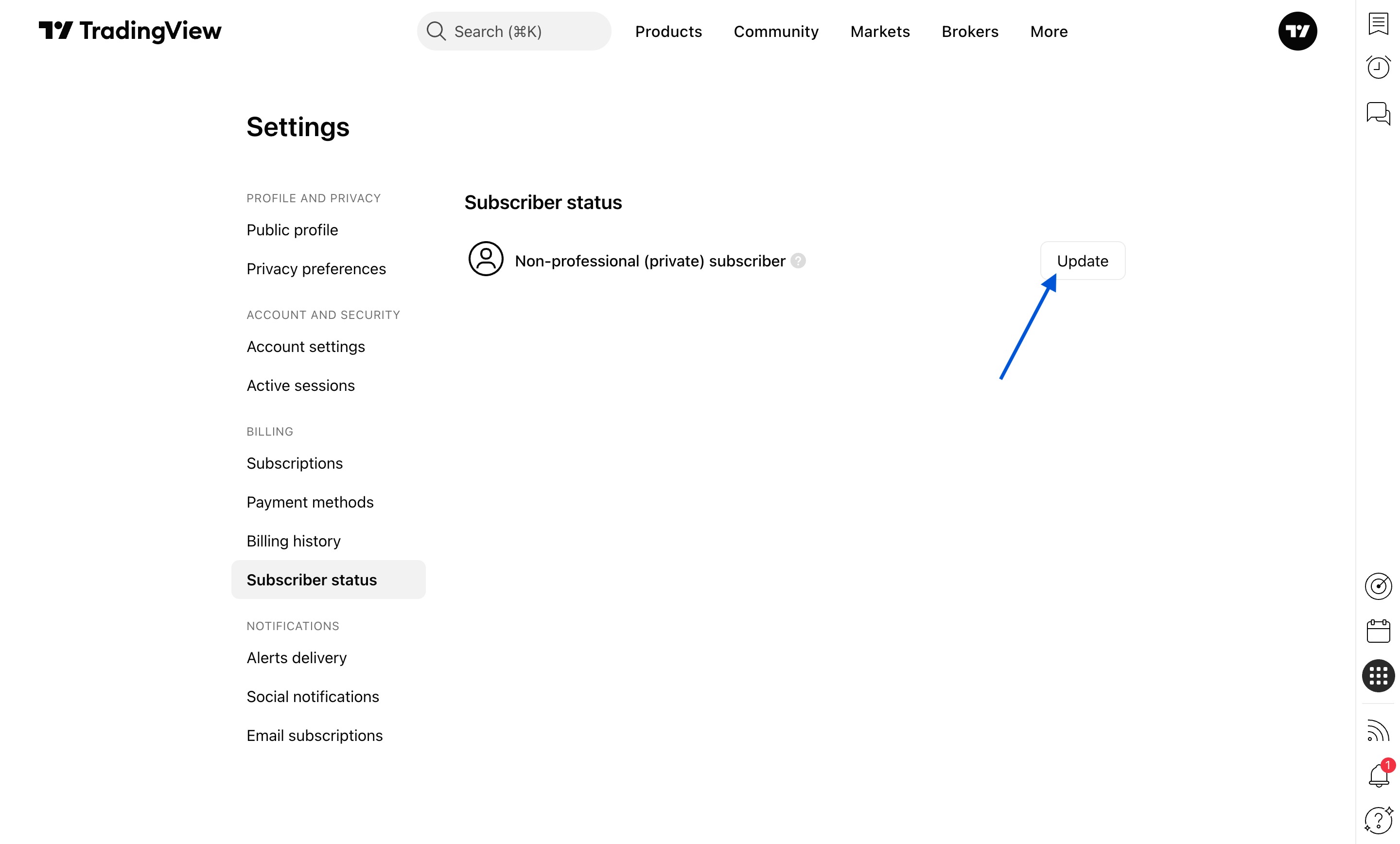 Le statut d'abonné peut être modifié sur la page Paramètres et facturation → Statut d'abonné en cliquant sur le bouton « Mettre à jour ».