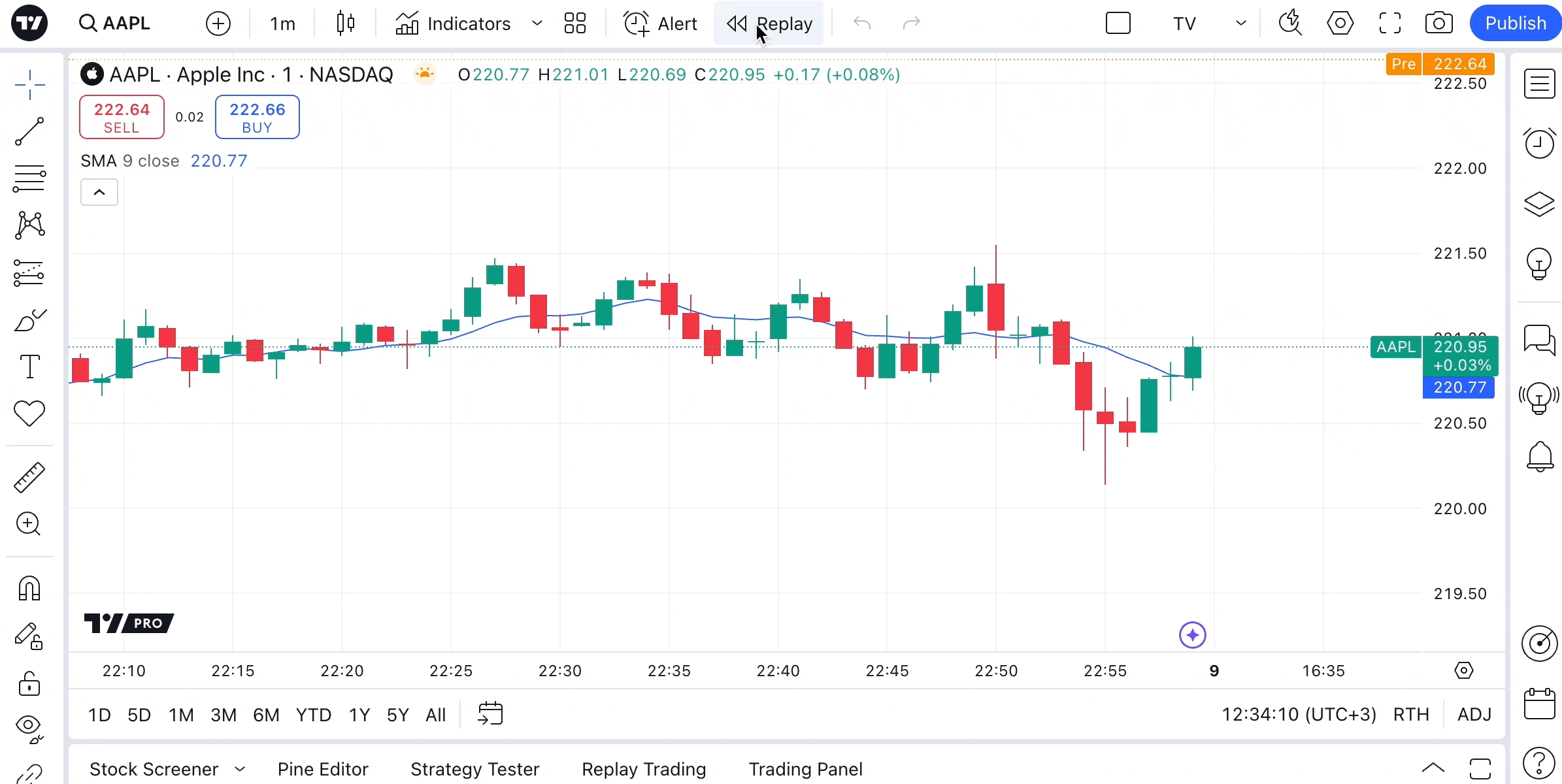 De plus, pour accéder aux données intraday détaillées basées sur le temps, vous pouvez sélectionner le point de départ de la relecture des barres sur un intervalle supérieur, puis passer à un intervalle inférieur. Par exemple, si vous souhaitez lire d'anciennes barres d'une minute, vous pouvez aller sur l'intervalle journalier, activer le mode Relecture, sélectionner l'option "Sélectionner la barre" et définir manuellement le point de départ quelque part sur le graphique dans les limites de votre plan. Ensuite, passez à un intervalle d'une minute et appuyez sur Lecture.