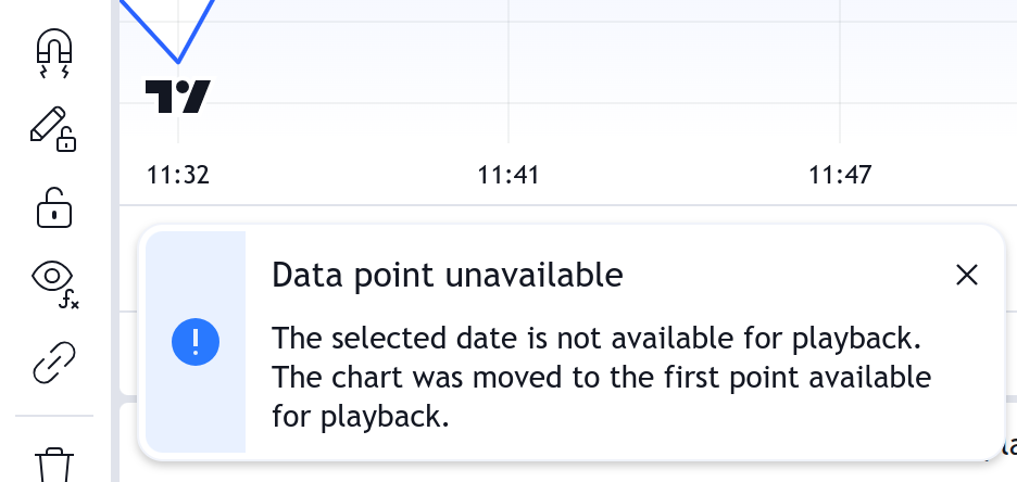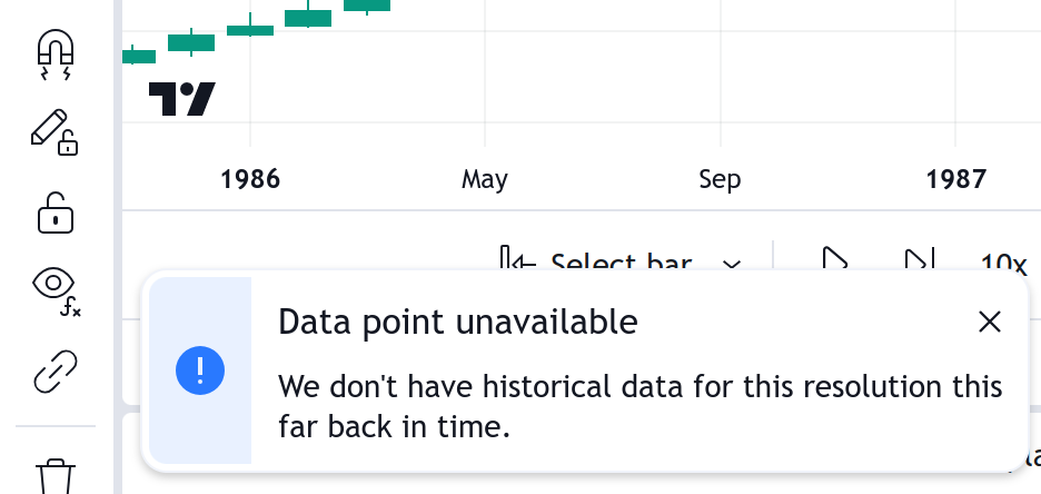 Lorsque vous passez d'intervalles supérieurs à inférieurs, il peut arriver qu'il y ait des données disponibles sur l'intervalle supérieur (par exemple, 1 jour) qui ne sont pas disponibles sur le graphique de l'intervalle inférieur (par exemple, 1 min), car la limite du plan intraday a été atteinte ou qu'il n'y a pas de données intraday dans notre stockage de données aussi loin dans le temps. Dans ce cas, vous verrez le message "Point de données indisponible" dans le coin inférieur gauche du graphique, et votre intervalle reste inchangé.