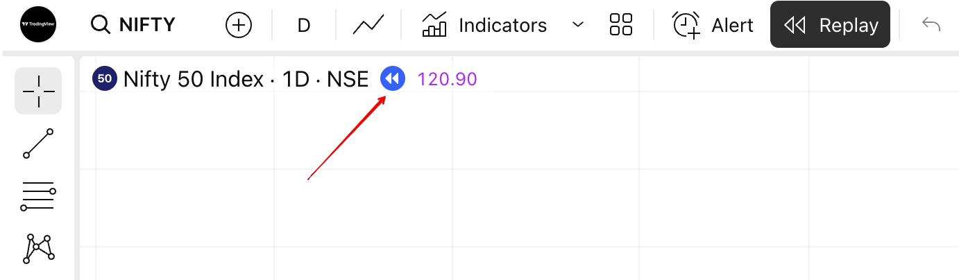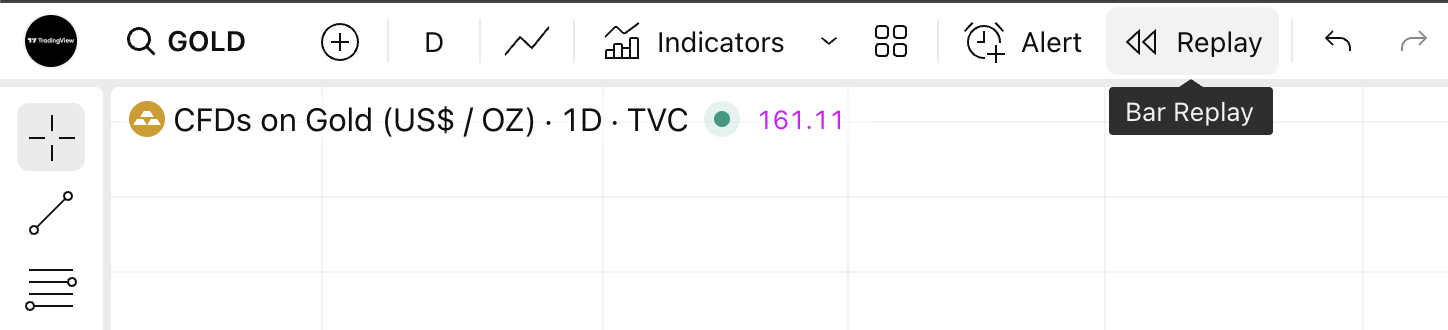 Ouvrez Bar Replay : commencez par trouver le bouton « Bar Replay » dans le panneau supérieur de votre graphique. Il ressemble à un bouton de rembobinage vidéo.