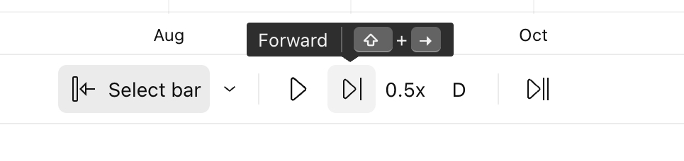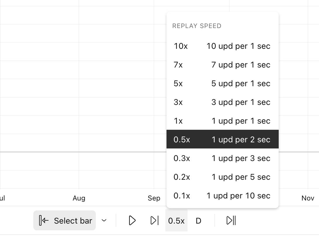 Vous pouvez sélectionner n'importe quel point de départ parmi les données historiques disponibles (allant de décennies de données quotidiennes à des données récentes seconde par seconde) et rejouer les mouvements du marché à des vitesses personnalisables.