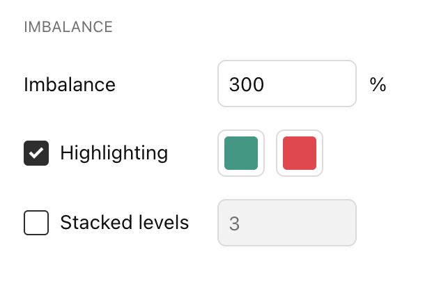 Un marché équilibré se produit lorsqu’il y a un équilibre entre l’offre et la demande, ce qui entraîne généralement une relative stabilité des prix. À l’inverse, un marché déséquilibré se produit lorsqu’il existe un écart significatif entre l’offre et la demande, ce qui conduit souvent à des mouvements de prix plus importants.Le graphique de footprint de volume détecte un déséquilibre acheteur lorsque le volume "achat" à un niveau de prix dépasse le volume "vente" au niveau inférieur d’un pourcentage spécifié. De même, il détecte un déséquilibre vendeur lorsque le volume "vente" à un niveau dépasse le volume "achat" au niveau supérieur du même pourcentage.Les utilisateurs peuvent contrôler le pourcentage par lequel le volume "achat" doit dépasser le volume "vente" (ou inversement) pour qu’un déséquilibre soit détecté, via l’entrée "Imbalance" dans les paramètres du graphique. Par défaut, cette valeur est de 300 % (c’est-à-dire que le volume d’un côté doit être trois fois plus élevé que celui de l’autre).Lorsqu’un déséquilibre acheteur est détecté, le graphique affiche une ligne verticale à droite du niveau de prix correspondant. Lorsqu’un déséquilibre vendeur survient, une ligne verticale apparaît à gauche du niveau.