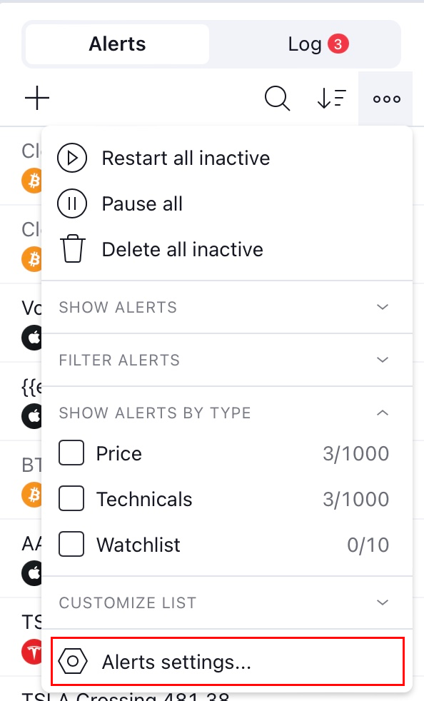 1. Ouvrez les paramètres des alertes dans le menu Options.