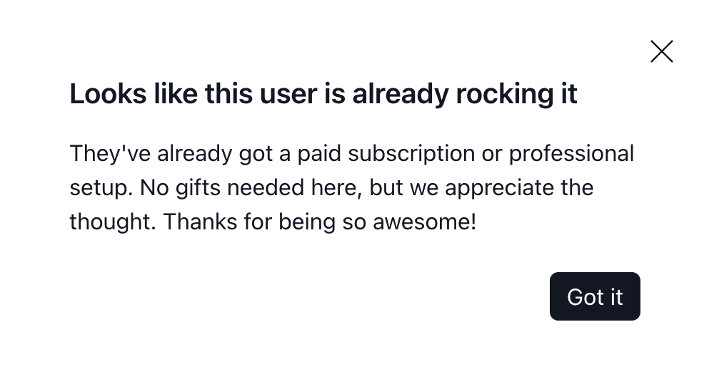 Veuillez noter que seuls les utilisateurs gratuits peuvent recevoir des abonnements offerts. Si l'utilisateur avec qui vous souhaitez partager unf offre ne peut pas recevoir d'abonnement pour le moment, vous verrez une notification contextuelle.