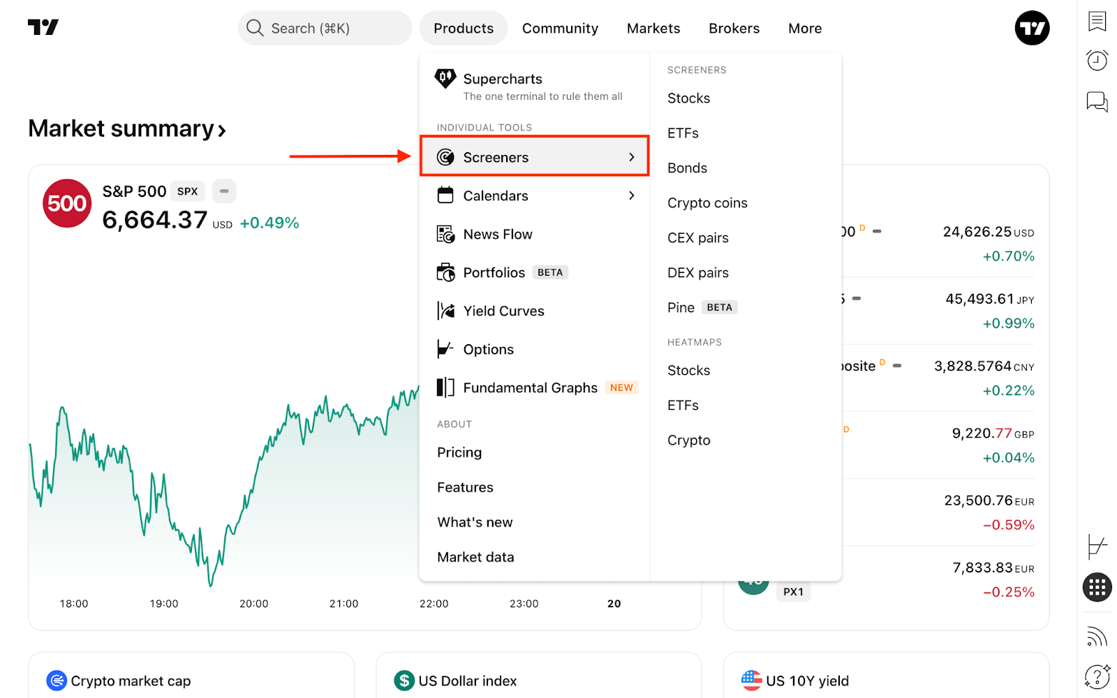 Une autre méthode consiste à passer par Supercharts. Dans la barre d'outils de droite, cliquez sur « Produits » → « Screeners ». En haut, cliquez sur « Stock Screener », puis sélectionnez « DEX Screener ».