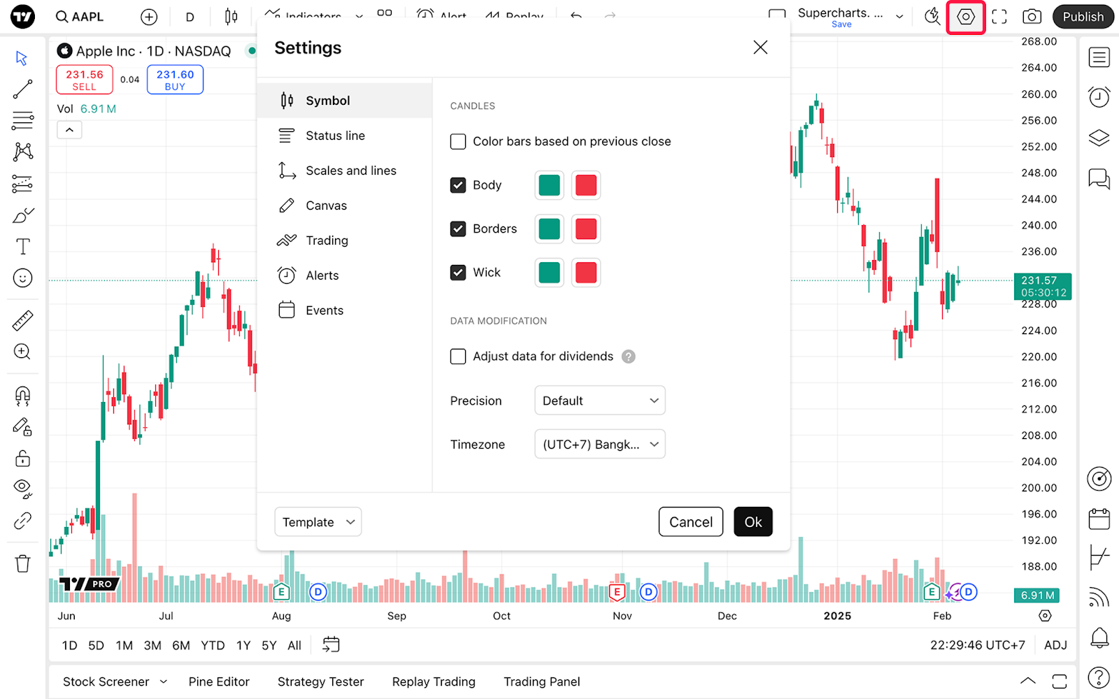 Une fois sur Supercharts, ouvrez le menu du type de graphique dans la barre d'outils supérieure et sélectionnez "Chandeliers".