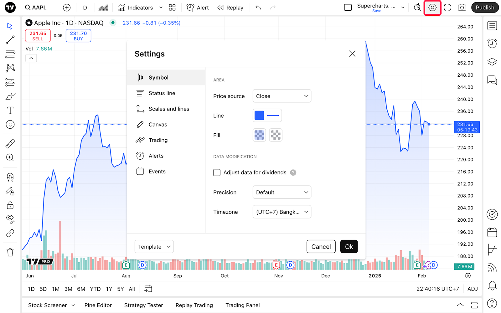 Pour ce faire, cliquez sur le bouton « Paramètres » en forme d'engrenage dans la barre d'outils supérieure, puis sélectionnez l'onglet « Symbole ».