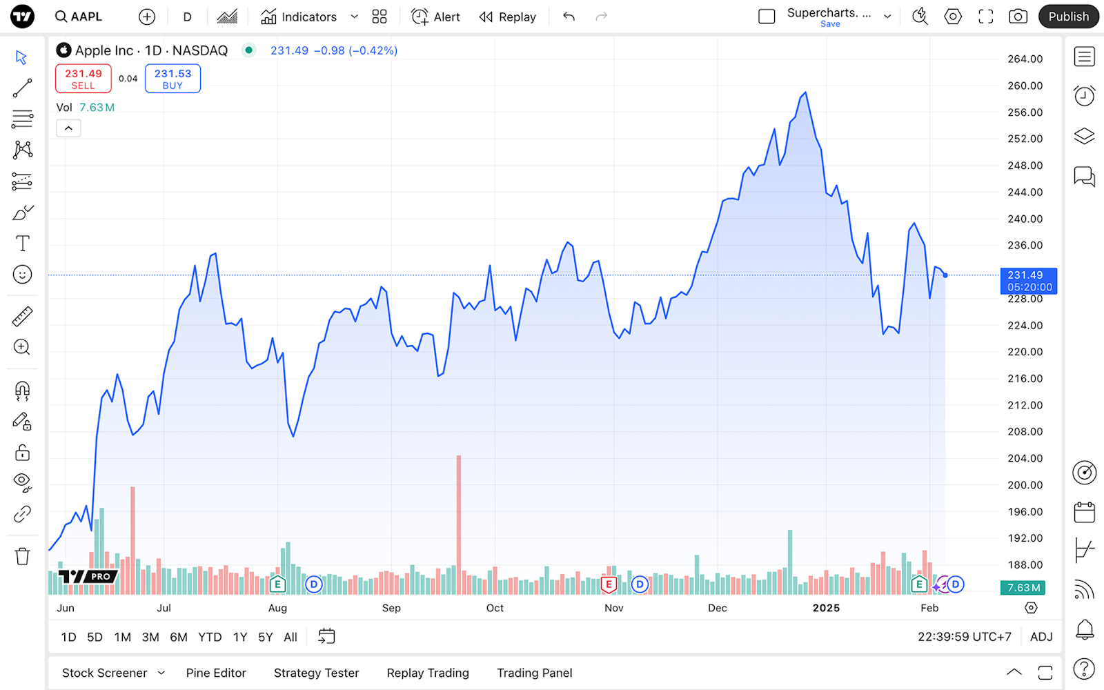 Sur Supercharts, vous pouvez accéder à des graphiques en aires, qui utilisent un remplissage sous la ligne des prix pour mettre en évidence les variations de prix. Dans le trading, les graphiques en aires sont souvent utilisés pour souligner l'ampleur des fluctuations de prix et aider les traders à identifier rapidement la direction et la force d'une tendance.