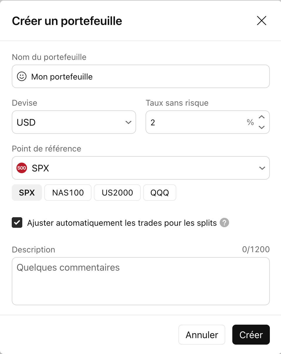 - Devise - Devise du portefeuille.Toutes les valeurs des actifs seront automatiquement converties dans cette devise si elles sont négociées dans une autre. Les liquidités sont également comptabilisées dans la devise du portefeuille.