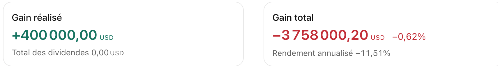 Le gain total en % est le rendement global du portefeuille calculé à l’aide de la méthode du rendement pondéré dans le temps (TWR). Cette mesure permet d’évaluer la performance de la stratégie de l’utilisateur.