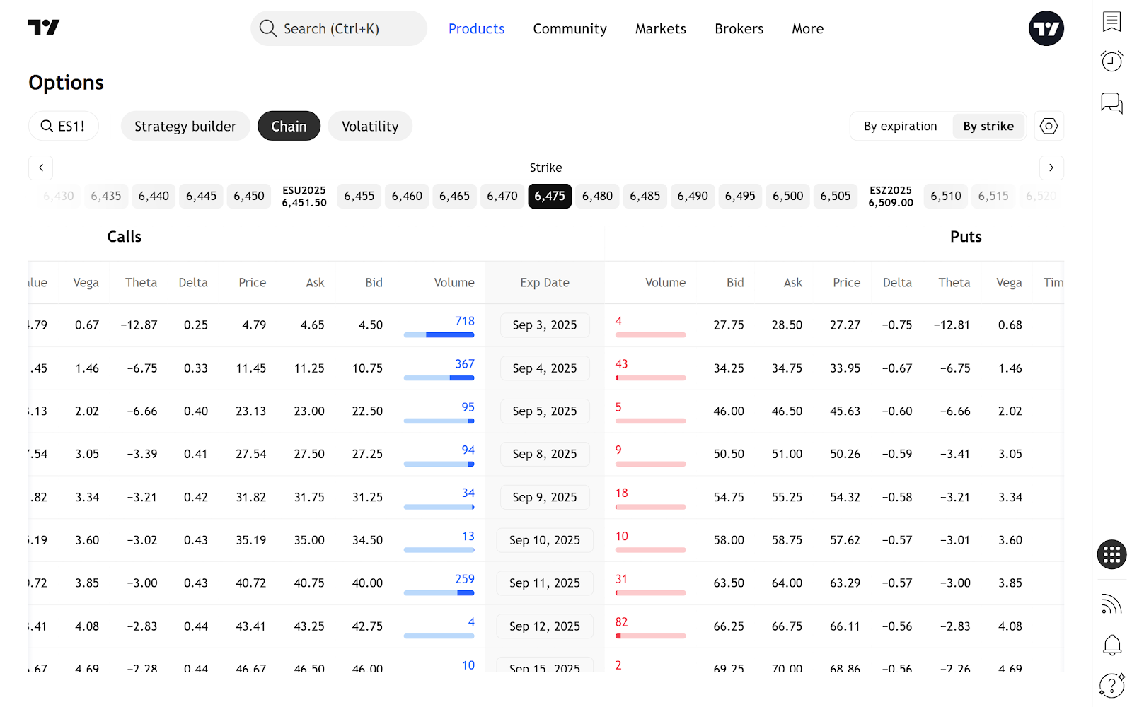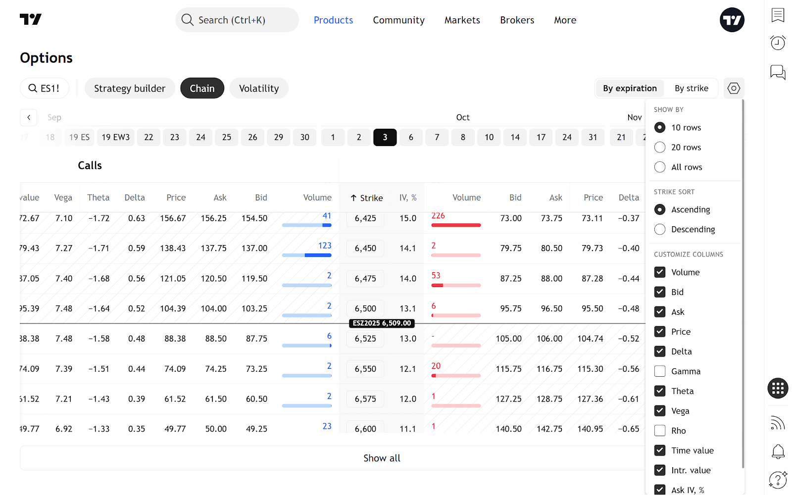 La chaîne d'options (également appelée tableau des options) est la fonctionnalité qui répertorie tous les contrats d'options disponibles pour un actif sous-jacent. Elle vous permet de consulter les prix des contrats et les statistiques clés, notamment le prix d'exercice et la date d'expiration. Il s'agit du principal point d'entrée lorsque vous souhaitez rechercher ou exécuter des transactions sur options pour un actif sous-jacent particulier.