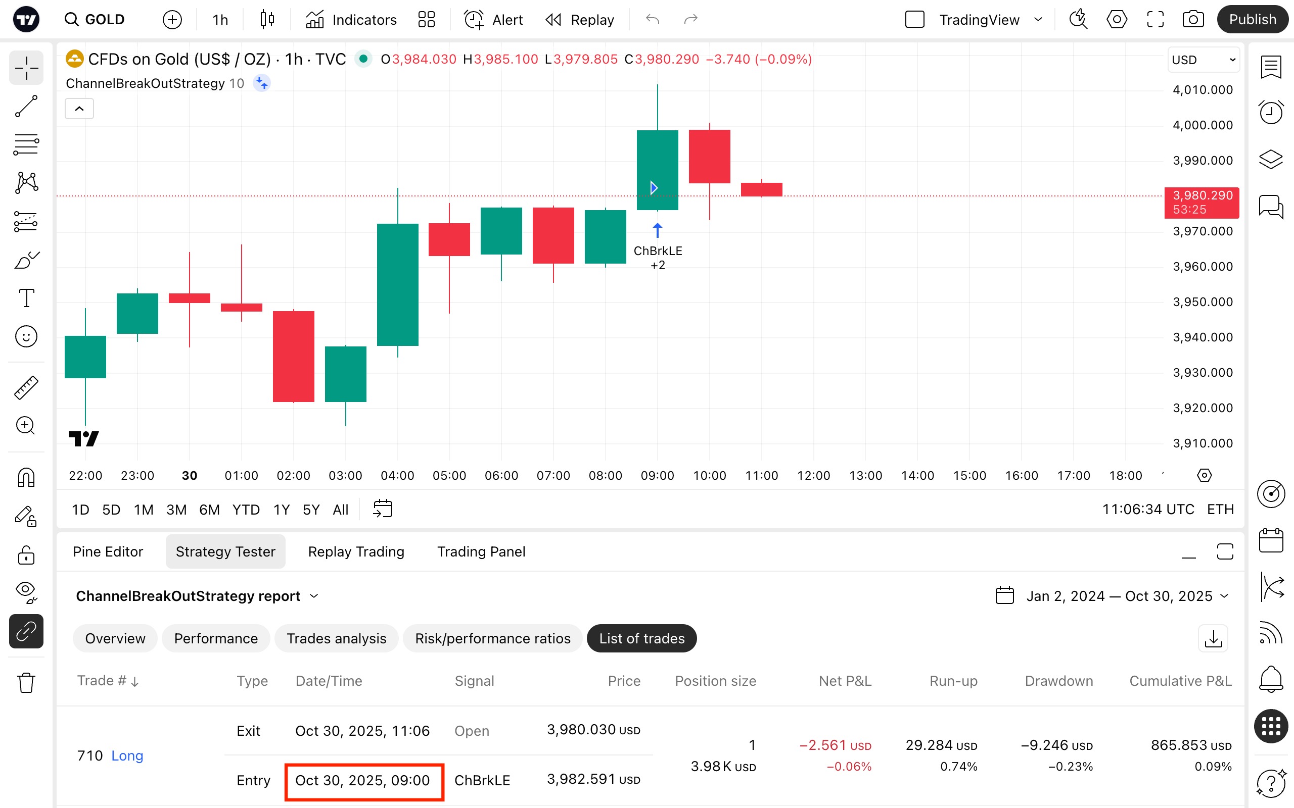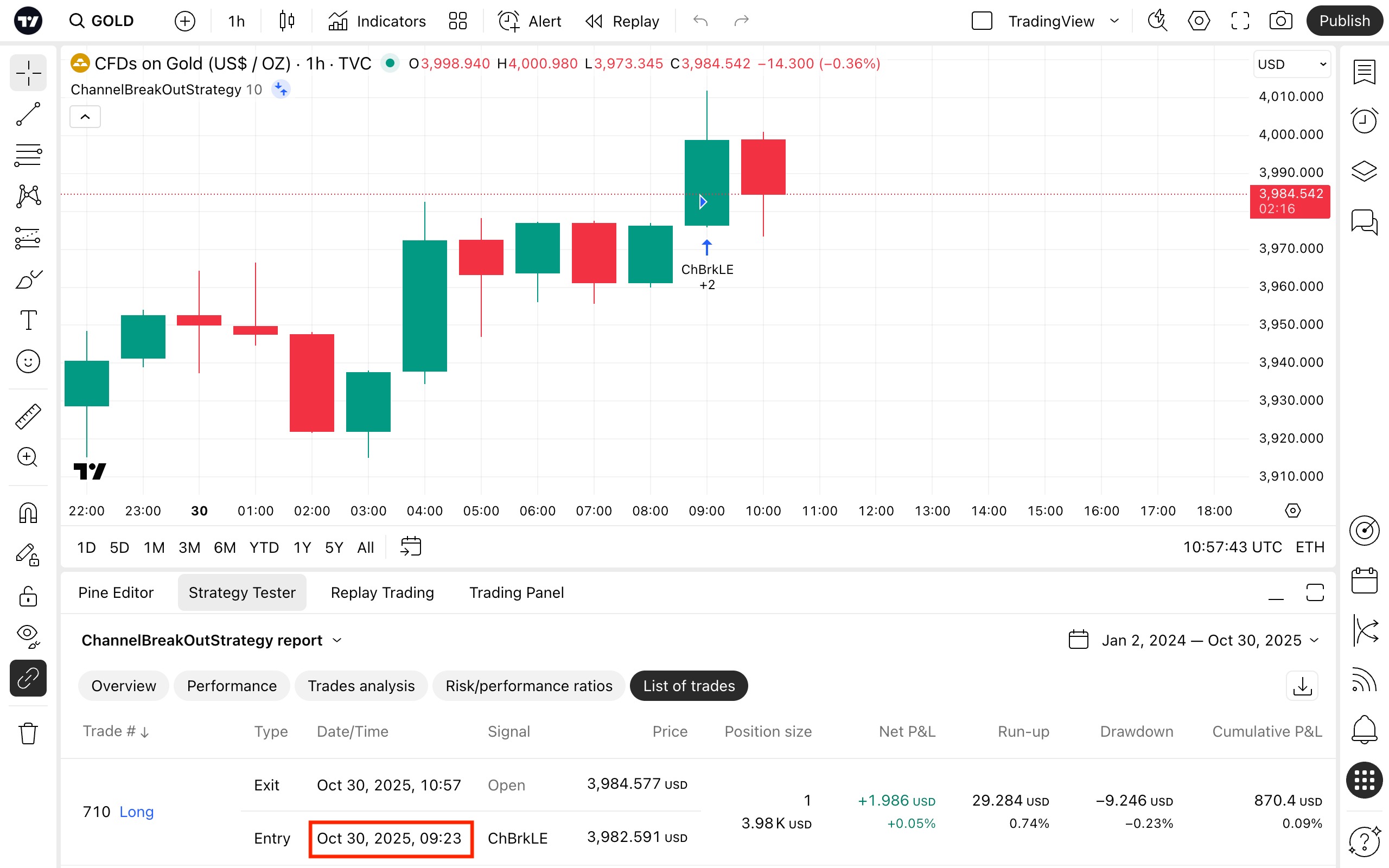 Une alerte affiche toujours l'heure exacte à laquelle elle a été déclenchée (dans le cas d'une alerte de stratégie, il s'agit de l'heure à laquelle l'ordre correspondant a été exécuté).Cependant, dans le testeur de stratégie, l'heure exacte d'exécution de l'ordre n'est affichée que pour les ordres en temps réel (c'est-à-dire les ordres pour lesquels la page du graphique était déjà ouverte au moment de l'exécution).Pour les ordres historiques (c'est-à-dire les ordres exécutés avant l'ouverture de la page du graphique), l'heure d'exécution de l'ordre correspond à l'heure d'ouverture de la barre correspondante.En effet, il est généralement impossible de déterminer l'heure exacte d'exécution d'un ordre historique, car les mouvements de prix intra-barre ne sont pas pris en compte dans le calcul d'une stratégie basée sur l'historique.Ainsi, l'heure d'exécution de l'ordre dans le testeur de stratégie ne correspond pas toujours à l'heure de déclenchement de l'alerte, et il peut sembler que l'alerte ait été déclenchée avec un retard.Ces divergences se produisent le plus souvent lors de l'exécution d'ordres à cours limité et lorsque les options « Recalculer après l'exécution de l'ordre », « Recalculer à chaque tick » et « Exécuter les ordres à la clôture de la barre » sont activées.Prenons par exemple la stratégie « ChannelBreakOutStrategy » et l'alerte créée pour celle-ci.Dans ce cas, l'ordre à cours limité a été exécuté en temps réel à 09h23 UTC :