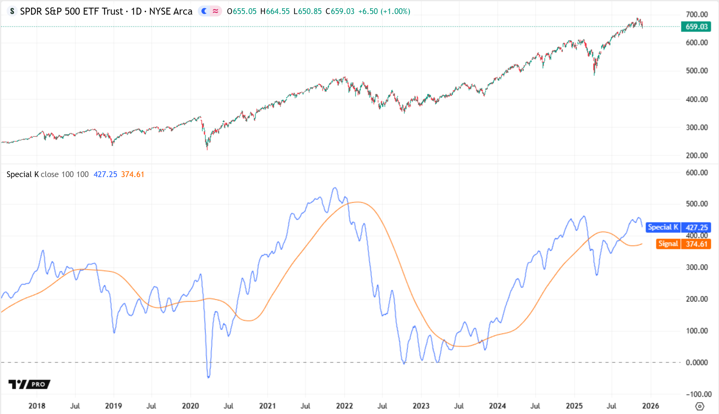 Le Special K, inventé par Martin J. Pring, est un indicateur de tendance et de momentum qui combine des taux de variation moyens sur plusieurs durées en un seul oscillateur, offrant une vue composite et filtrée des cycles de prix sur le court, moyen et long terme. S'appuyant sur les concepts de l'indicateur Know Sure Thing (KST) et sur des années d'observation du marché, Pring a conçu le Special K pour identifier les tendances primaires et les retournements, et pour aider à synchroniser les transactions à court terme allant dans le sens de la tendance.
