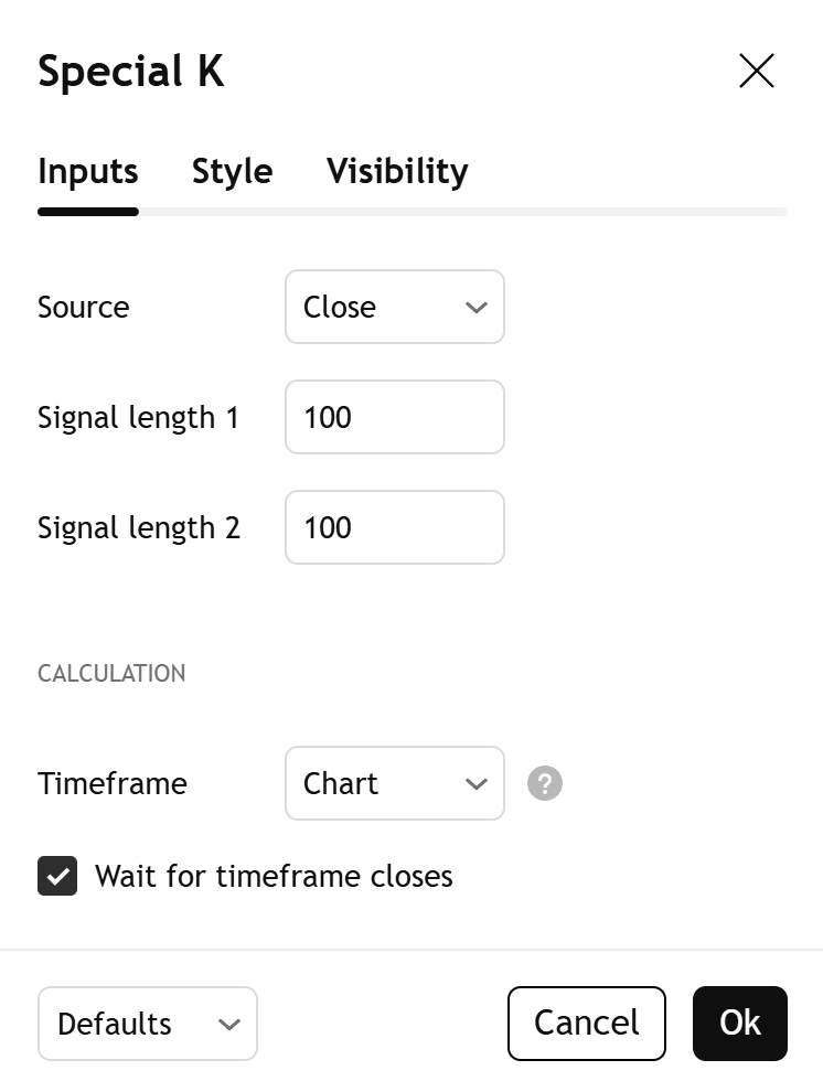 Le résultat est un oscillateur composite représentant une combinaison pondérée de cycles de marché significatifs avec un bruit réduit. L'indicateur comprend également une ligne de signal doublement lissée pour détecter les retournements. Par défaut, il calcule la MMS de 100 barres du Special K, puis applique une seconde MMS de 100 barres au résultat. Vous pouvez personnaliser les longueurs de lissage de la ligne de signal à partir de l'onglet "Paramètres" (Inputs) des configurations de l'indicateur.
